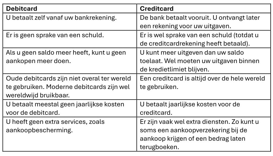 De belangrijkste verschillen tussen een debitcard en een creditcard zijn: